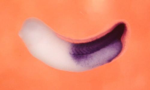 hoxc10 (homeobox C10) gene expression in Xenopus laevis embryo, assayed via in situ hybridization, NF stage 31, lateral view, anterior left, dorsal up. Copyright © Patient Lab Image created by: Aldo Ciau-Uitz