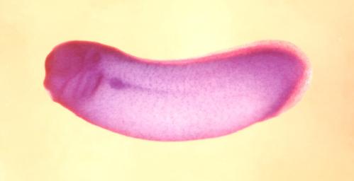 ptprf (protein tyrosine phosphatase receptor type, F) gene expression in Xenopus laevis embryo, assayed via in situ hybridization, NF stage 28, anterior left, dorsal up. Copyright © Patient Lab Image created by: Aldo Ciau-Uitz
