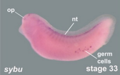 sybu (syntabulin) gene expression in Xenopus laevis embryo, NF stage 33 & 34, as assayed by in situ hybridization, lateral view, anterior left, dorsal up. Image published in: Colozza G and De Robertis EM (2014) Copyright © 2014. Image reproduced with permission of the Publisher and the copyright holder. This is an Open Access article distributed under the terms of the Creative Commons Attribution License.