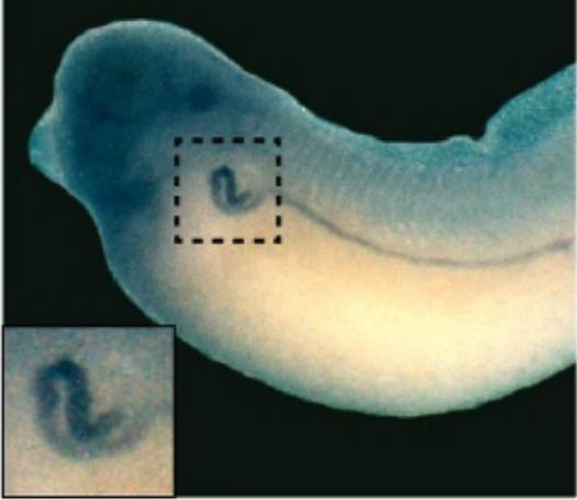 |   | clcnkb (chloride voltage-gated channel Kb) gene expression in X. laevis embryo, NF stage 39, assayed via in situ hybridization, lateral view, anterior left, dorsal up. This image is extracted from figure published in: Cervino AS et al. (2023), Image published in: Cervino AS et al. (2023) © The Author(s) 2023. Creative Commons Attribution license