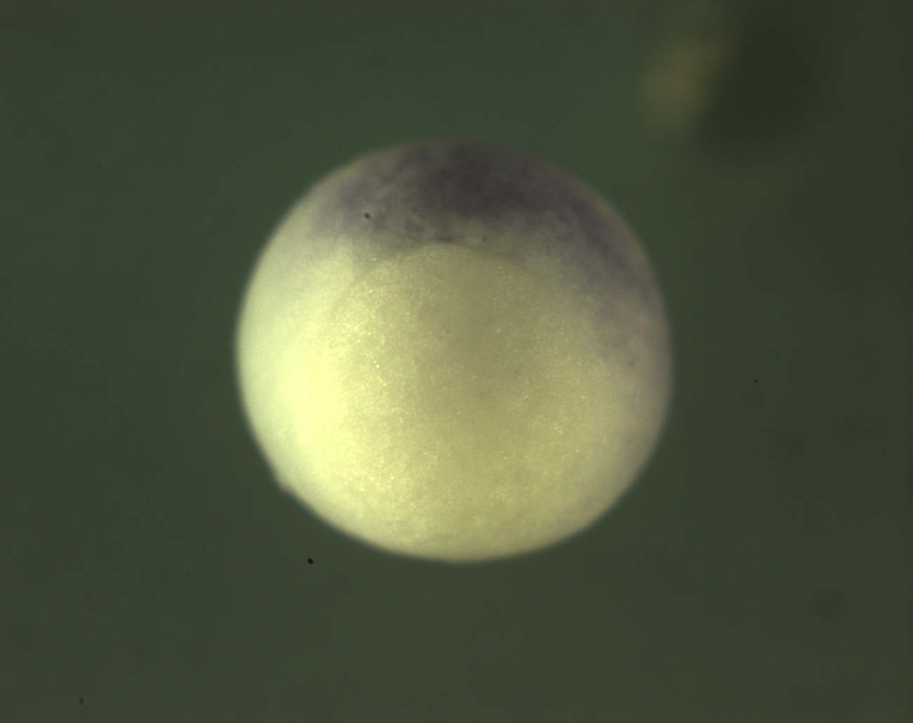 tmeff2 (transmembrane protein with EGF-like and two follistatin-like domains 2) gene expression in Xenopus laevis embryo, assayed via in situ hybridization, NF stage 10, blastoporal view, dorsal up.