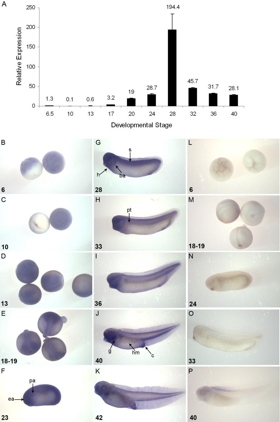 Figure 2. xWnt6 mRNA is expressed during Xenopus organogenesis. A: Quantitative reverse transcriptase-polymerase chain reaction analysis shows the relative expression levels of Wnt6 mRNA. Wnt6 expression is normalized to histone H4 levels. B-K: xWnt6 mRNA localization determined by whole-mount in situ hybridization using a digoxigenin-labeled xWnt6-specific LNA probe. L-P: Control embryos hybridized with a digoxigenin-labeled nonspecific LNA control probe. Numerical figures indicate the developmental stage. Note, xWnt6 mRNA initially localizes to animal pole and neural fold tissues, then more generally throughout the ectoderm and later in epithelial tissues and in the somites, the developing eye and pronephros. ba, branchial arches; c, cloaca; ea, eye anlage; g, gills; h, heart; hm, hypaxial muscles; nf, neural folds; pa, pronephric anlage; pt, pronephric tubules; s, somites. Image published in: Lavery DL et al. (2008) Copyright © 2008. Image reproduced with permission of the Publisher, John Wiley & Sons.