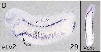 etv2 (ETS variant transcription factor 2) gene expression in Xenopus laevis embryo, assayed via in situ hybridization, NF stage 29 &30, lateral view, anterior left, dorsal up. This image is extracted from figure published in: Salanga MC et al. (2010), Image published in: Salanga MC et al. (2010) Copyright © 2010. Image reproduced with permission of the Publisher, John Wiley & Sons.