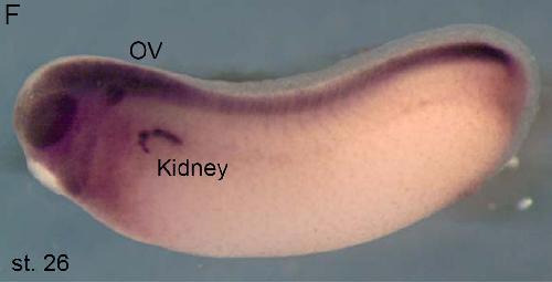 rfx2 ( regulatory factor X, 2 ) gene expression in Xenopus laevis embryos, NF stage 26, as assayed by in situ hybridization, lateral view, anterior left, dorsal up. This image is extracted from figure published in: Chung MI et al. (2012), Image published in: Chung MI et al. (2012) Copyright © 2012. Image reproduced with permission of the Publisher, Elsevier B. V.