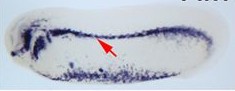 kdr (kinase insert domain receptor (a type III receptor tyrosine kinase) gene expression in Xenopus laevis embryo, assayed via in situ hybridization, NF stage 26, lateral view, anterior left, dorsal up. The dorsal lateral plate mesoderm is indicated by the red arrow. This image is extracted from figure published in: Ciau-Uitz A et al. (2013), Image published in: Ciau-Uitz A et al. (2013) Copyright © 2013. Image reproduced with permission of the Publisher and the copyright holder. This is an Open Access article distributed under the terms of the Creative Commons Attribution License.