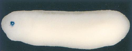 crybb1 (crystallin, beta B1 ) gene expression in Xenopus laevis embryos, NF stage 26, as assayed by in situ hybridization. Lateral view: anterior left, dorsal up. This image is extracted from figure published in: Altmann CR et al. (1997), Image published in: Altmann CR et al. (1997) Copyright © 1997. Image reproduced with permission of the Publisher, Elsevier B. V.