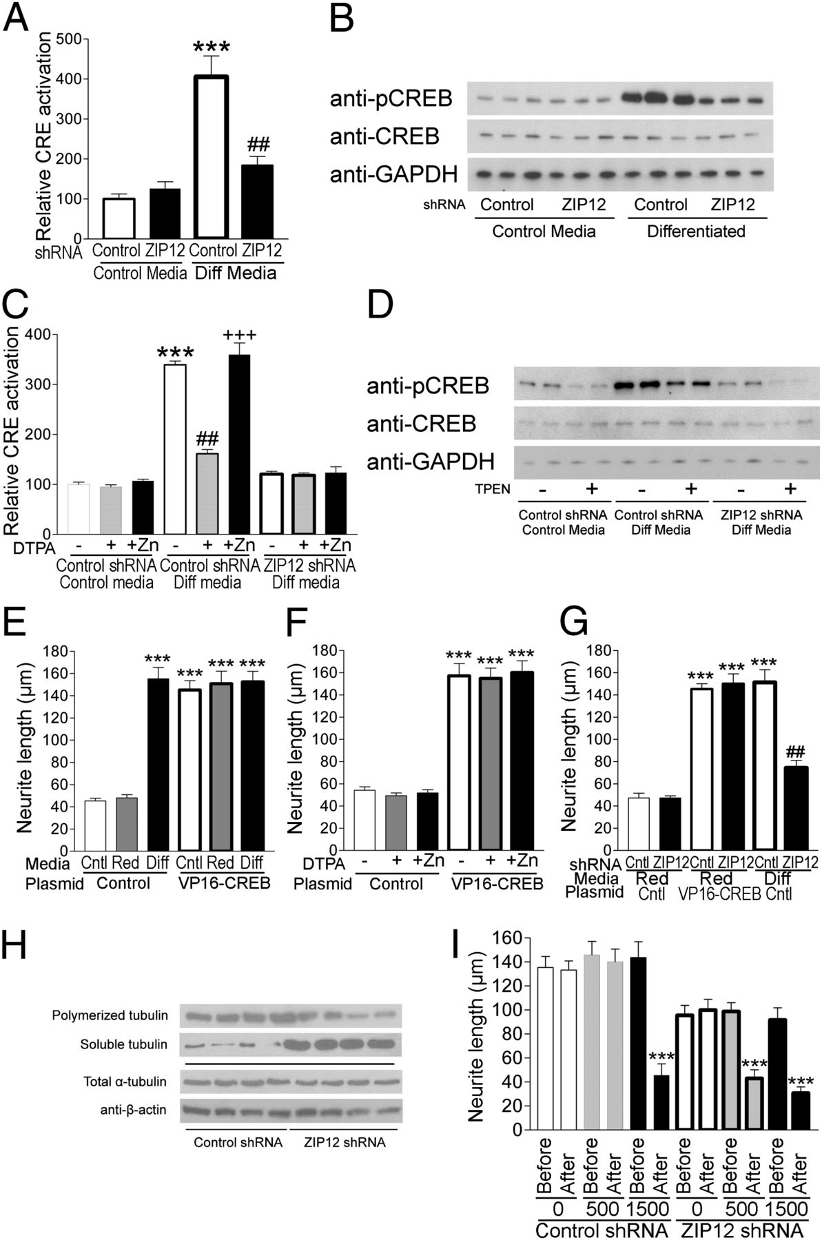 ZIP12 is required for CREB signaling and tubulin polymerization. (A and B) Differentiation of N2a cells increases cAMP response element (CRE) activation (n = 6, ± SE) and CREB phosphorylation, both of which are blunted by ZIP12 shRNA-mediated knockdown. ***P ##P C) Extracellular Zn2+ chelation by DTPA mimics the blunting of CREB activation in differentiated cells induced by ZIP12 shRNA knockdown (n = 6, ± SE). ***P ##P +++P D) Intracellular Zn2+ chelation by TPEN reduces phosphorylation of CREB regardless of ZIP12 shRNA knockdown. (E) Constitutive activation of CREB by VP16-CREB1 transfection increases neurite extension in the absence of RA. ***P F and G) Neurite outgrowth induced by constitutive activation of CREB is not affected by (F) extracellular Zn2+ chelation or (G) ZIP12 shRNA-mediated knockdown. ***P ###P H) ZIP12 knockdown alters soluble and polymerized tubulin fractions in N2a cells without affecting total tubulin protein expression. (I) ZIP12 knockdown in differentiated N2a cells increases sensitivity to neurite retraction following microtubule destabilization by nocodazole (n = 50, ± SE). ***P