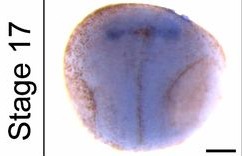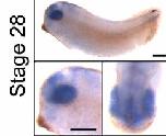 scl39a12 (solute carrier family 39 (zinc transporter), member 12) gene expression in Xenopus tropicalis embryo, assayed via in situ hybridization, NF stage 28, lateral view, anteriorleft, dorsal up (top and bottom left panel), dorsal view of head, anterior down (bottom right view).
