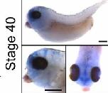 scl39a12 (solute carrier family 39 (zinc transporter), member 12) gene expression in Xenopus tropicalis embryo, assayed via in situ hybridization, NF stage 40, lateral view, anteriorleft, dorsal up ( top and bottom left panel), dorsal view of head, anterior down ( bottom right view).