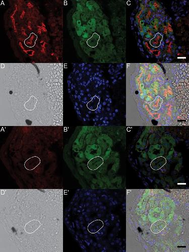 Fig 4. Xl-VSP protein is expressed on the lumenal surface of embryonic pronephroi.NF stage 42 Cdh17:GFP X. laevis embryos were sectioned and stained to test for VSP protein. Kidney tubules were identified by the presence of the Cdh17:GFP transgene (B, B'). Sections stained with anti-VSP (A) showed fluorescence on the lumenal surface (corresponding to the apical membrane) of the proximal kidney tubule cells (outlined in white). Anti-VSP staining was only observed in the presence of anti-VSP (A-F) and not in secondary antibody alone control sections (A'-F'). Panels (A, A') anti-VSP or no anti-VSP control; (B, B') GFP transgene; (C, C') fluorescence signal overlay of A, B and E; (D, D') bright field images; (E, E') Hoechst 33342 (to mark nuclei); (F, F') signal overlay of A, B, D and E. IHC was repeated three times with three different embryonic cohorts. Shown are representative sections. Scale bar = 25 μm.