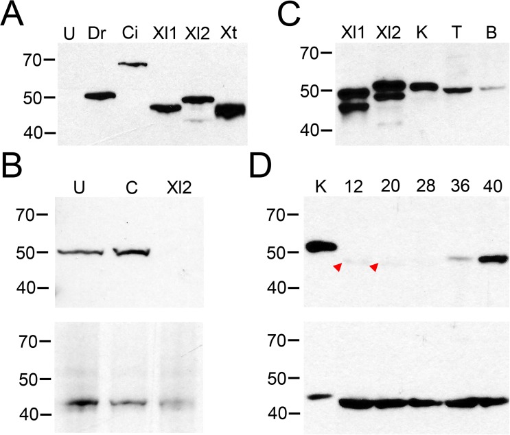 Fig 3. X. laevis tissues and embryos show VSP protein expression.(A) Western blot validation of N432/21 anti-VSP in X. laevis oocytes injected with cRNA for Dr-VSP (Dr), FLAG-Ci-VSP (Ci), Xl-VSP1 (Xl1), Xl-VSP2 (Xl2), Xt-VSP (Xt), or left un-injected (U). All VSPs tested were recognized by the antibody. Un-injected oocytes (U) display no band. Dr-VSP, Xl-VSP1, Xl-VSP2 and Xt-VSP have a predicted MW of 58 kDa while FLAG-Ci-VSP has a predicted MW of 66 kDa. The slight difference in electrophoretic mobility between VSPs and their predicted MWs and the nature of the double band for Xl-VSP1 and Xl-VSP2 (as seen in panels A and C) has not been determined. These results show that anti-VSP N432/21 is specific for VSP and cross-reacts with VSPs from multiple species. (B) X. laevis zygotes were injected with either a control morpholino, an Xl-VSP2 morpholino or left un-injected. (top) Western blot analysis of equal amounts of lysates from embryos at stage 42 shows a band at the predicted MW for Xl-VSPs (58 kDa) for un-injected and control embryos and no band for the Xl2 morpholino-injected embryos. (bottom) Blots were stripped and re-probed with anti-actin for a loading control. (C) Western blot analysis of X. laevis tissues. Lysates from adult kidney (K, 3 μg), testis (T, 30 μg), and brain (B, 10 μg) were run against lysates from oocytes injected with RNAs for Xl-VSP1 (Xl1) and Xl-VSP2 (Xl2) and analyzed by Western blot with anti-VSP. A single band of approximately the correct MW (58 kDa) was observed in the tissue lysates, indicating the presence of Xl-VSP protein in all tissues tested. (D) Western blot analysis of X. laevis embryos. Lysates from NF stage 12–40 embryos (30 μg each) were run against a lysate from adult kidney (K, 5 μg). Blots were probed either with anti-VSP (top) or anti-actin (bottom) as a loading control (predicted MW 42 kDa). A weak band (potentially corresponding to Xl-VSP1) is present only at early embryonic stages 12–20 (red arrowheads), whereas a slightly slower-migrating band (potentially corresponding to Xl-VSP2) accumulates at later embryonic stages 36–40. The difference between the kidney and embryo lysate MWs for both VSP and actin may reflect a different degree of post-translational modification in embryos versus adult X. laevis. Lysates, gels and blots were repeated three times with either three different adults or three different embryonic cohorts. Shown are representative gels for each.