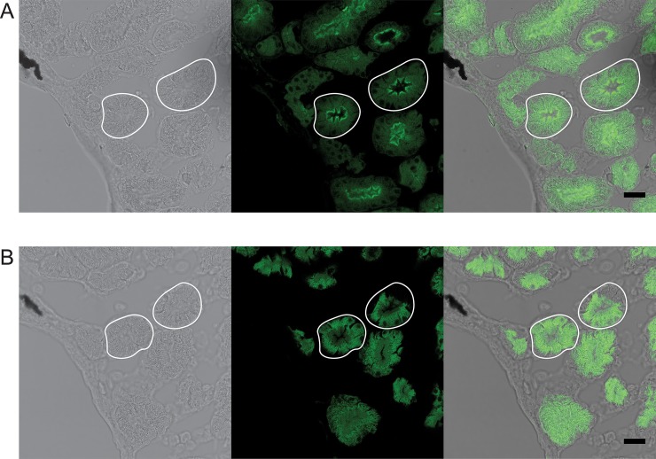 Fig 5. Xl-VSP protein is expressed on the lumenal surface of adult kidney tubule epithelial cells.(A) Adult kidney sections were stained with anti-VSP and anti-mouse IgG-Alexa 488. Xl-VSP staining is observed on the lumenal surface (marked with arrowheads) of the kidney tubules (two outlined in white). This surface corresponds to the apical membrane and not the basolateral membrane of the epithelial cells. (B) Apical membrane staining was not seen on a consecutive section in the absence of anti-VSP primary antibody. IHC was repeated on sections from kidneys of three different adult males. Shown are representative sections. Scale bar = 25 μm.