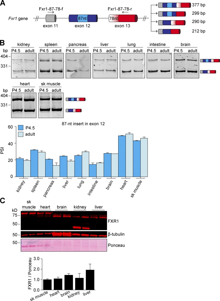Figure S2. Alternative splicing events in exons 12 and 13 of Fxr1 pre-mRNA and expression of FXR1 protein isoforms during tissue development. (A) Scheme of part of Fxr1 gene showing the alternative splicing events in exons 12 (insert of 87 nt) and exon 13 (alternative splice site leading to the inclusion or skipping of a 78-nt region). To evaluate the splicing patterns by RT-PCR, the primers designed to target the constitutive flanking exons were Fxr1-87-78-f (forward) and Fxr1-87-78-r (reverse). (B) Different tissues were collected from neonatal (P4.5) and adult (4-mo-old) mice. Alternative splicing was evaluated by RT-PCR and quantified by densitometry. n = 3â4 (P4.5 tissues) samples from two to nine pooled neonates each depending on tissue type, n = 4 (adult tissues) animals. (C) Adult mouse tissues were evaluated by Western blots using a monoclonal antibody against the N terminus of FXR1 protein that thus recognizes all of the splice variants. n = 2 animals. Data are means ± SEM, *P ⤠0.05 (one-way ANOVA test with Bonferroni correction for multiple comparisons). sk muscle, skeletal muscle. Fig. S2 is linked to Fig. 2. |