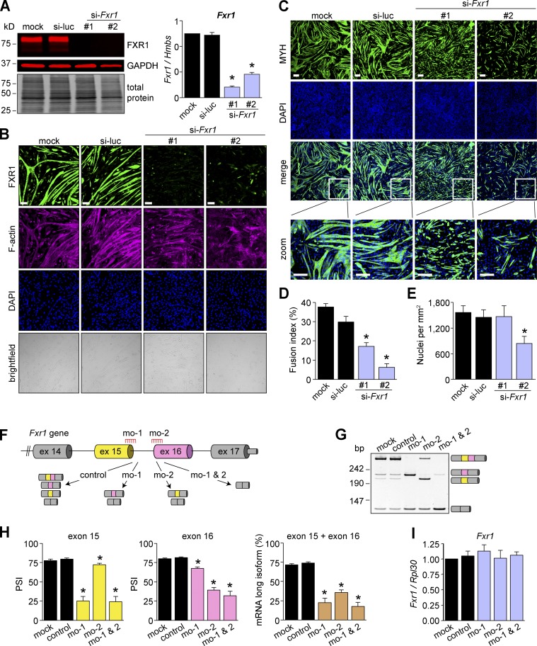 Figure S3. FXR1 is required for myogenesis. (A–E) C2C12 myoblasts were transfected with two different siRNAs targeting Fxr1 (#1, #2) or a control siRNA (si-luc), and the next day differentiation was induced. Protein and RNA were collected at differentiation day 4, and FXR1 depletion was confirmed by Western blot and qPCR assays (A). Cells were evaluated by immunofluorescence to confirm knockdown. Scale bars, 100 µm (B). MYH expression was evaluated by immunofluorescence (C), and the fusion index was estimated (D). The number of nuclei per field of view was estimated from the microscopy images (E). Data are means ± SEM, *P ≤ 0.05 versus mock and si-luc (Student’s t test, two sided), n = 4–8 independent experiments. Scale bars, 200 µm. (F–I) MOs were delivered in undifferentiated myoblasts, and the next day cells were differentiated for 4 d. Scheme of the MOs used to target exons 15 (mo-1) and 16 (mo-2) where control denotes cells treated with a MO control (F). Efficiency of MO action was evaluated by RT-PCR (G) and quantified (H). Total Fxr1 mRNA levels were evaluated by qPCR (I). mo-1& 2 indicates that cells were treated with both mo-1 and mo-2 at the same time. Data are means ± SEM, *P ≤ 0.05 versus mock and control (Student’s t test, two sided), n = 3–8 independent experiments. Fig. S3 is linked to Figs. 3 and 4. |