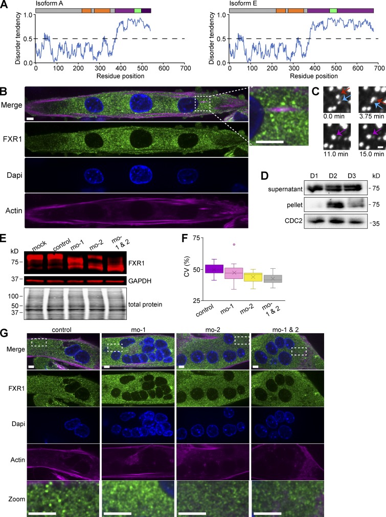 Figure 4. Alternative splicing results in disordered protein isoforms that are capable of phase separation. (A) Disorder predictions based on the primary aa sequence of FXR1 isoforms A and E using the IUPRED algorithm. (B) Endogenous FXR1 protein was visualized by immunofluorescence in myotubes using an antibody against the N terminus of FXR1 (recognizes all splice variants). Representative images depicting FXR1 puncta. Scale bar, 5 µm. Inset shows droplets magnified fourfold. Dapi, 6′-diamidino-2-phenylindole. (C) Time-lapse acquisition of human isoform 2 FXR1-EGFP (pAGB828). Two condensates (red and blue arrows) fuse together to form one (purple arrow). Scale bar, 1 µm. (D) C2C12 myoblasts were differentiated for 1, 2, or 3 d (D1, D2, D3). Cell lysates and pellets were analyzed by Western blot using an FXR1 antibody specific to the C terminus of isoform E. (E–G) MOs targeting exons 15 (mo-1) and/or 16 (mo-2) were delivered in myoblasts, and the next day cells were differentiated for 4 d. Cells were analyzed by Western blotting and immunofluorescence using an antibody against FXR1 N terminus (E). The CV was calculated as a measurement of FXR1 condensation. P > 0.5 mo-1 versus mo-control, P < 0.001 mo-2 and mo-1 & 2 versus mo-control (F). Representative images of MO-treated cells showing FXR1 puncta. Scale bar, 5 µm. Bottom row shows droplets magnified fivefold (G). Data are standard box and whisker plot. Fig. 4 is linked to Fig. S3, F–I. |