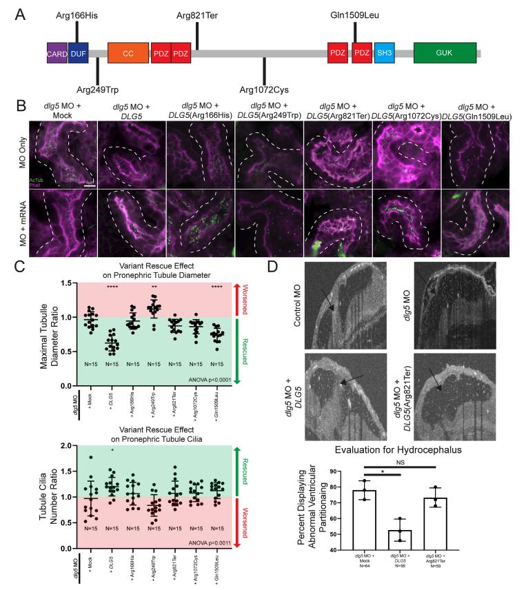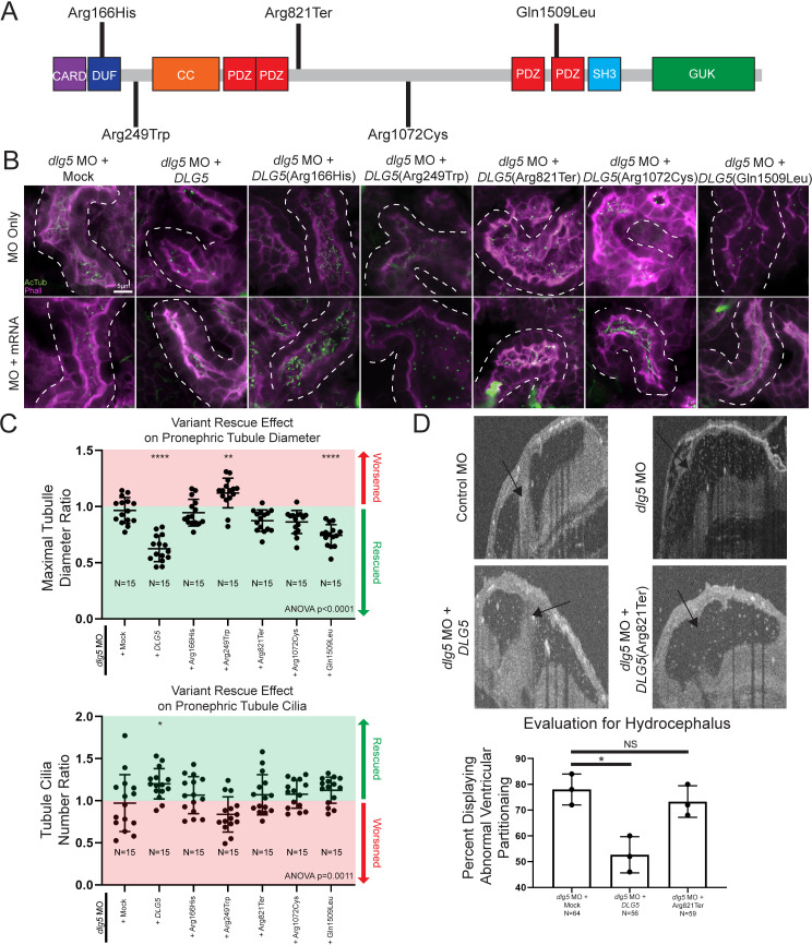 Figure 3. Xenopus model of discs large 5 (dlg5) loss of function provides a platform for testing variant pathogenicity. (A) Schematic diagram of DLG5 protein with domain annotations and locations and effects of uncovered patient variants. CARD, caspase activation and recruitment domain; DUF, domain of unknown function; CC, coiled-coil domain; PDZ, postsynaptic density protein disc large tumour suppressor and zonula occludens-1 domain; SH3, src homology 3 domain; GUK, membrane-associated guanylate kinase domain. (B) Representative images of proximal pronephric tubule ciliation and morphology. Dotted lines indicate bounds of tubule assessed in the image. (C) Quantitation of cilia and tubule morphology rescue efficiency of wildtype and variant DLG5 mRNA demonstrate the differing functionality of DLG5 variants. Ratios are calculated as values from sides with mRNA along with MO divided by values from MO only sides. Red indicates ratios suggesting an exacerbation of the phenotype while green indicates ratios suggesting rescue of the phenotype. (D) Representative images and quantitation of brain ventricle morphology rescue efficiency of wildtype and p.Arg821Ter variant DLG5 mRNA demonstrate the loss of functionality of the p.Arg821Ter DLG5 variant. Statistical tests carried out as analysis of variance (ANOVA) followed by Dunnett’s multiple comparison test with ****p<0.0001, **p<0.005 and *p<0.05 (C) or an unpaired t-test test with *p<0.05 (D). Bars indicate mean and SD of individual values (C) or replicate means (D). |