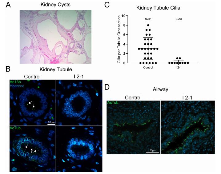 Figure 5. Proband tissue bearing discs large 5 (DLG5) variant c.745C>T (p.Arg249Trp) displays tissue-specific deficits in ciliation. (A) Representative H&E stain of I 2–1 kidney showing cystic morphology. (B) Control 23 weeks and I 2–1 weeks fetal kidney tissue cross-section immunofluorescence labelling of cilia Arl13b or acetylated tubulin show a loss of cilia in DLG5 variant tissue. (C) Quantitation of cilia number in each cross-sectional kidney tubule analysed. (D) Control 23 weeks and I 2–1 weeks fetal lung airway tissue cross-section immunofluorescence labelling of cilia acetylated tubulin shows intact airway ciliation in DLG5 variant tissue. Bars indicate mean and SD of individual counts. |