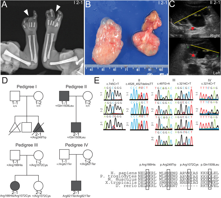Figure 1 Whole exome sequencing identifies discs large 5 (DLG5) variants in patients. (A) Radiograph of patient I 2â1 fetal upper extremities reveals bilateral ectrodactyly. (B) I 2â1 fetal kidneys were largely cystic and dysplastic. (C) Ultrasound of II 2â1 kidneys show hydronephrosis. Yellow line depicts span of kidney and red arrows indicate dilated renal pelvis. (D) Pedigrees depict families in which the DLG5 variants were identified. (E) Sanger sequencing confirming variant allele presence and amino conservation through phylogeny for the mutated allele of DLG5. |