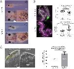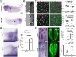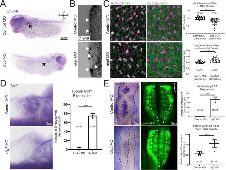 Figure 4 Knockdown of discs large 5 (dlg5) in Xenopus embryos causes cell polarity and Hedgehog signalling dysfunction. (A) Representative images of dnah9 in situ hybridisation in control MO and dlg5 MO sides of a stage 28 embryo depict fainter expression signal in the dlg5 depleted side. (B) Representative transverse sections of control MO and dlg5 MO sides of a stage 28 embryo reveal the more basal location of cells expressing the dnah9 marker of MCC cell fate. (C) Representative immunofluorescence images and quantitation of AcTub-positive ciliated cells/area and Lectin-positive goblet cells/area in control MO and dlg5 MO sides of a stage 28 embryo demonstrate the decreased density of MCCs and concomitant increased density of goblet cells in dlg5 depleted Xenopus epidermis. (D) Representative WISH for foxf1 Hedgehog target expression in control MO and dlg5 MO stage 45 pronephroi demonstrate the decreased Hedgehog signalling activity in dlg5 depleted pronephroi. (E) Representative expression and quantitation of ptch1 in control MO and dlg5 MO stage 45 brain ventricles as well as representative expression and quantitation of Pax6 in control MO and dlg5 MO stage 45 fourth ventricle demonstrate a decrease in ptch1 expression and expansion of Pax6. Black dotted line delineates bounds of the brain and white dotted line delineates bounds of fourth ventricle floor. A, anterior; D, dorsal; P, posterior; V, ventral. Statistical tests carried out as two-tailed t-tests for cell density (C) and Pax6 expression (E) and unpaired t-tests for foxf1 (D) and ptch1 (E) expression with ***p<0.005âand ****p<0.0001. Bars indicate mean and SD of individual values (EâPax6 expression) or replicate means (D and Eâfoxf1 or ptch1 expression). |