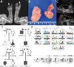 Figure 1. Whole exome sequencing identifies discs large 5 (DLG5) variants in patients. (A) Radiograph of patient I 2â1 fetal upper extremities reveals bilateral ectrodactyly. (B) I 2â1 fetal kidneys were largely cystic and dysplastic. (C) Ultrasound of II 2â1 kidneys show hydronephrosis. Yellow line depicts span of kidney and red arrows indicate dilated renal pelvis. (D) Pedigrees depict families in which the DLG5 variants were identified. (E) Sanger sequencing confirming variant allele presence and amino conservation through phylogeny for the mutated allele of DLG5. |