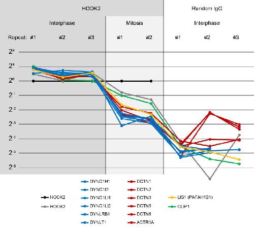 Figure 4—figure supplement 1. Characterization of the HOOK2 C-terminal peptide antibody.(Related to Figures 4, 5 and 8) We performed immunoprecipitation-mass spectrometry (IP-MS) on Protein G Dynabeads functionalized with anti-HOOK2. In three repeat extracts, we measured three conditions: anti-HOOK2 in interphase extracts (columns 1 to 3), anti-HOOK2 in mitotic extracts (columns 4 and 5), and as negative control, random IgG in interphase (columns 6 through 8). HOOK2 conditions were normalized so the amount of HOOK2 was constant. Random IgG conditions were normalized to have the same IgG count as the average IgG count of the HOOK2 columns. Then for each protein, the sum across channels was normalized, so the abundance values represent relative enrichment across the eight channels. Abundances are shown on a log scale with base 2. We here show dynein subunits (blue), dynactin subunits (red), and other proteins known to interact with dynein-dynactin (yellow, green) that came down in the immunoprecipitations. The interaction between HOOK2 and the dynein-dynactin complex was stronger in interphase (left columns) than in mitosis (middle columns).Figure 4—figure supplement 1—source data 1. Immunoprecipitation-mass spectrometry (IP-MS) counts for Figure 4—figure supplement 1. |