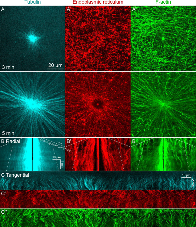 Figure 1—figure supplement 1. Higher magnification imaging around MTOCs included signatures of both co-movement and relative movement of astral MTs, ER, and F-actin.(Related to Figure 1, Video 1) (A) MTs imaged at near-speckle concentrations with tubulin-Alexa Fluor 647, ER labeled with DiI, and F-actin labeled with Lifeact-GFP. Images taken on a spinning disk confocal microscope with 60x objective. (B) Radial kymographs generated by averaging the intensity over 10° sectors originating at the MTOC. One end remained pinned at the MTOC, and the other end rotated with the average flow of ER, so features would remain in the sector, and the kymograph would highlight their radial movement. To guide the eye, the solid lines indicate the growing aster periphery (slope corresponds to 30 µm/min), and the dotted lines track with outward sliding of tubulin speckles away from the MTOC (slope corresponds to 3 µm/min). (C) Tangential kymographs generated along a circle centered on the MTOC, so moving features represent tangential displacement with respect to the MTOC. |