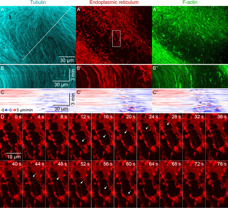 Figure 3—figure supplement 1. Higher magnification imaging around zones included signatures of both co-movement and relative movement of astral MTs, ER, and F-actin.(Related to Figure 3, Video 4) (A) MTs labeled with tubulin-Alexa Fluor 647, ER labeled with DiI, and F-actin labeled with Lifeact-GFP. Images taken on a spinning disk confocal microscope with 60x objective. (B) Kymographs along the line indicated in panel A. (C) Velocity maps in the same frame of reference as panel B. Velocity maps represent the horizontal component of the velocity estimated by PIV. (D) Temporal montage of the box indicated in panel A’ showing an example of deformation of the ER. Time with respect to the start of the montage. |