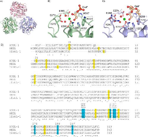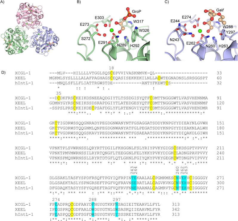 Figure 1. A) Previously reported crystal structure of trimeric hIntL-1 (PDB ID 4WMY) [10]. B) Ligand binding site in a previously reported crystal structure of XEEL (PDB ID 4WN0) [14]. C) Ligand binding site in a previously reported crystal structure of hIntL-1 (PDB ID 4WMY) [10]. D) Sequence alignment between XCGL-1, XEEL, and hIntL-1. Cysteine residues are labeled in yellow. Residues in the ligand binding sites are labeled in cyan. ∗,:, and. denote conserved, highly similar, and similar residues, respectively.