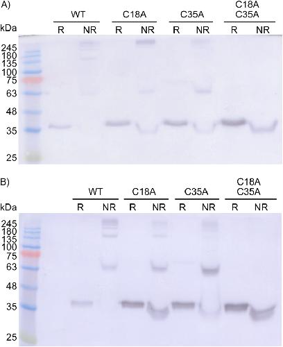 Figure 2. Western blot analysis of wild-type (WT) XCGL-1 and XCGL-1 with mutations at non-conserved cysteine residues using a pan-intelectin antibody. R = reducing conditions and NR = non-reducing conditions. A) XCGL-1 expressed in HEK293T cells. The uncropped image is shown in Figure S8. B) XCGL-1 expressed in T. ni cells. The uncropped image is shown in Figure S9.