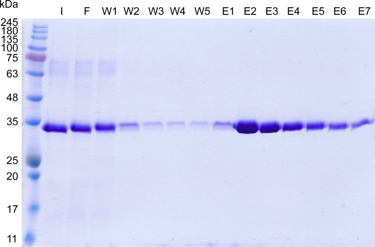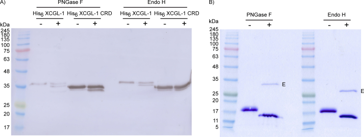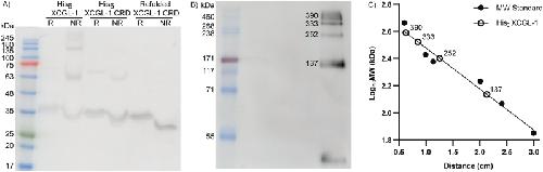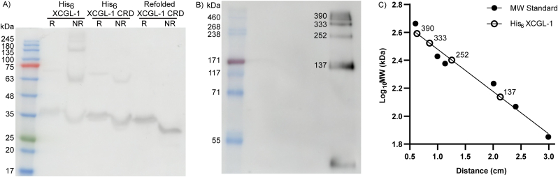 Figure 3. Molecular weight of XCGL-1 species. A) Western blot of XCGL-1 species under reducing (R) and non-reducing (NR) conditions probed with a pan-intelectin antibody. The uncropped image is shown in Figure S10. B) Western blot of His6 XCGL-1 under non-reducing conditioned probed with an anti-His6 antibody. The uncropped image is shown in Figure S11. C) Molecular weight standard plot with the molecular weight of the marker (solid circles) and molecular weight of His6 XCGL-1 bands (white circles).