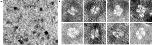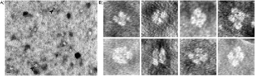 Figure 4. Transmission electron micrograph of His6 XCGL-1. A) A representative field. The black bar at the bottom left corner is 200 Å long. The 4-lobed particles are indicated by arrows. B) Representation particles, not including those in A). Each particle box is 200 × 200 Å.