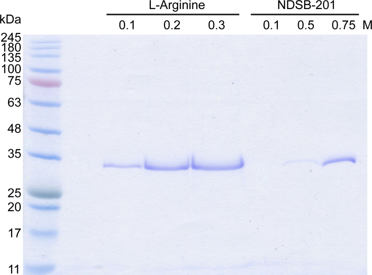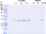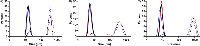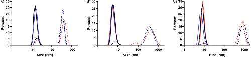 Figure 5. Size measurement of XCGL-1 variants by dynamic light scattering. A) His6-XCGL-1. B) His6-XCGL-1 CRD. C) Refolded XCGL-1 CRD. Three independent data sets were measured for each protein and shown as three different colors. The dash lines showed size distribution by intensity and the solid lines of the same color showed size distribution by number from the same experiment.