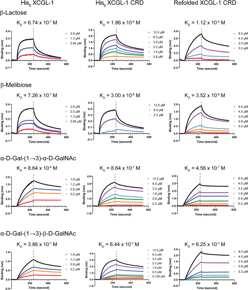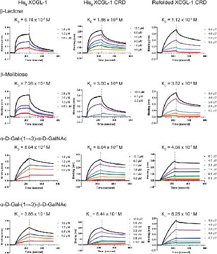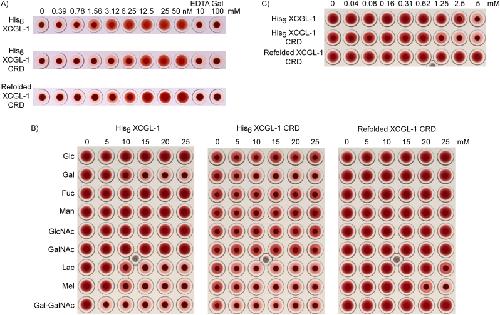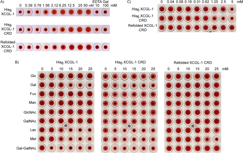 Figure 8. A) Hemagglutination activity of XCGL-1 variants. The number indicates XCGL-1 concentrations in nanomolar. EDTA and galactose was added as indicated at millimolar concentrations in the presence of 50 nM XCGL-1. B) Inhibition of hemagglutination by various carbohydrates in the presence of 25 nM XCGL-1. C) Inhibition of hemagglutination by α-D-Gal-(1→3)-D-GalNAc at lower concentrations than in B). Glc = D-glucose, Gal = D-galactose, Fuc = L-fucose, Man = D-mannose, GlcNAc = N-acetyl-D-glucosamine, GalNAc = N-acetyl-D-galactosamine, Lac = lactose (β-D-Gal-(1→4)-D-Glc), Mel = melibiose (α-D-Gal-(1→6)-D-Glc), Gal-GalNAc = α-D-Gal-(1→3)-D-GalNAc.