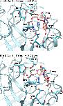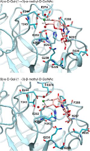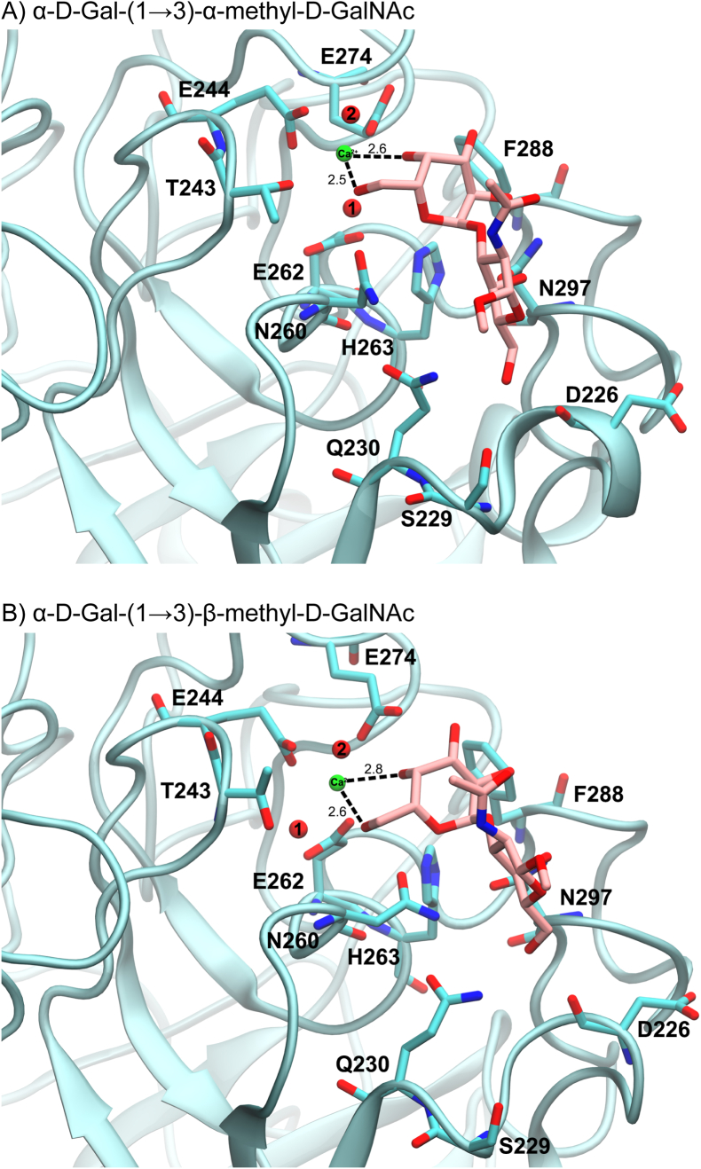 Figure 9. Model of galactosides bound in the ligand binding site of XCGL-1. The distances are in Å. A) α-D-Gal-(1→3)-α-methyl-D-GalNAc in orientation B. B) α-D-Gal-(1→3)-β-methyl-D-GalNAc.