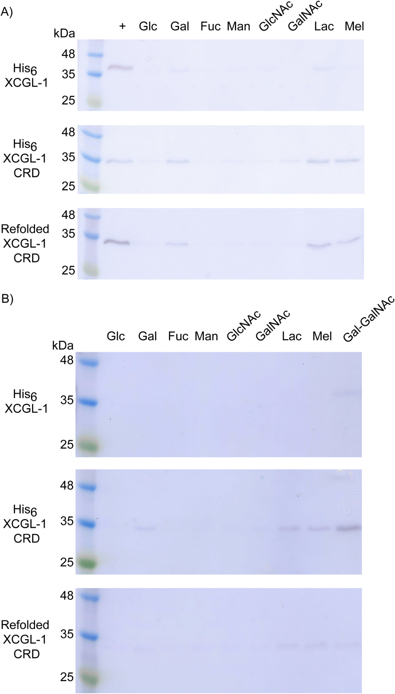 Figure 6. A) Elution of XCGL-1 bound to different carbohydrate resins by EDTA. The uncropped images are shown in Figure S12, Figure S13, and Figure S14. B) Competitive elution of XCGL-1 bound to lactose resin by various carbohydrates. The uncropped images are shown in Figure S15, Figure S16, and Figure S17. XCGL-1 CRD was detected with a pan-intelectin antibody. His6-tagged proteins were detected with an anti-His tag antibody (pan-intelectin antibody yielded similar results). Glc = D-glucose, Gal = D-galactose, Fuc = L-fucose, Man = D-mannose, GlcNAc = N-acetyl-D-glucosamine, GalNAc = N-acetyl-D-galactosamine, Lac = lactose (β-D-Gal-(1→4)-D-Glc), Mel = melibiose (α-D-Gal-(1→6)-D-Glc), Gal-GalNAc = α-D-Gal-(1→3)-D-GalNAc.