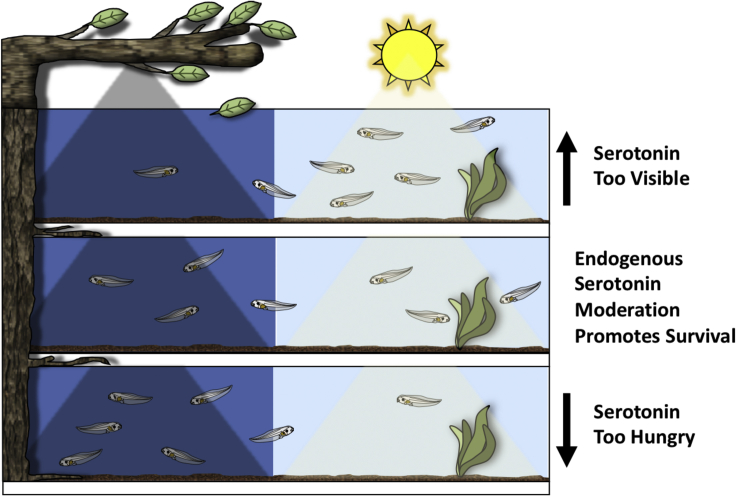 Innate visually guided behaviors are thought to promote survival by guiding organisms to sources of food and safety and away from harm without requiring learning. Historically, innate behaviors have been considered hard-wired and invariable, but emerging evidence shows that many innate behaviors are flexible and complex due to modulation. Here, we investigate the modulation of the innate preference for light displayed by the Xenopus laevis tadpole, an exceptionally invasive and well-studied organism that is known to display several different innate visually guided behaviors. We found that tadpoles display a circadian-regulated oscillation in their preference for light over dark which can be altered by experimentally increasing or decreasing levels of serotonin transmission. We also found that endogenous levels of serotonin transmission during the day maintain a consistently moderate preference for light. Theoretically, a moderate preference for light, as opposed to a strong preference, optimizes survival by rendering tadpoles' behavior less predictable.