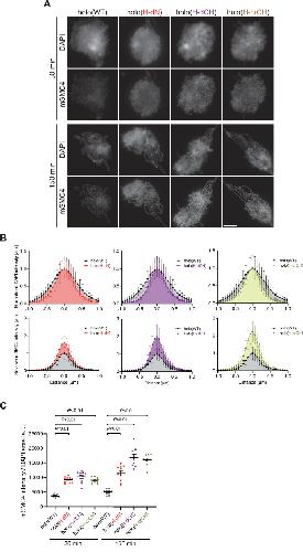 Figure 1—figure supplement 2. Deletion of and mutations in the conserved helix accelerates condensin I loading and mitotic chromosome assembly.(A) Mouse sperm nuclei were incubated with condensin-depleted M-HSS that had been supplemented with holo(WT), holo(H-dN) holo(H-dCH), or holo(H-crCH) at a final concentration of 35 nM. After 30 and 150 min, the reaction mixtures were fixed and processed for immunofluorescence labeling with an antibody against mSMC4. DNA was counterstained with DAPI. Shown here is a representative image from over 10 chromosome clusters examined per condition. Scale bar, 10 μm. (B) Line profiles of mitotic chromosomes observed at 150 min in the experiment shown in (A). Signal intensities of DAPI (top) and mSMC4 (bottom) from the chromosomes assembled with holo(WT) (black), holo(H-dN) (red), holo(H-dCH) (purple), or holo(H-crCH) (yellow) were measured along with the lines drawn perpendicular to chromosome axes (n = 20). The error bars represent the mean ± standard deviation (SD). The mean and SD were normalized individually to the DAPI intensities (arbitrary unit [a.u.]) at the center of chromosome axes (distance = 0 μm) within each set. Intensities of mSMC4 signals from holo(H-dN), holo(H-dCH), and holo(H-crCH) were normalized relative to the value from holo(WT). A dataset from a single representative experiment out of two repeats is shown. (C) Quantification of the intensity of mSMC4 per DNA area in the experiment shown in (A) (n = 10 clusters of chromosomes). The error bars represent the mean ± standard error of the mean (SEM). The p values were assessed by Tukey’s multiple comparison test after obtaining a significant difference with one-way analysis of variance (ANOVA) at each time point. A dataset from a single representative experiment out of two repeats is shown. Figure 1—figure supplement 2—source data 1. Microsoft excel of non-normalized data corresponding to Figure 1—figure supplement 2B.Figure 1—figure supplement 2—source data 2. Microsoft excel of non-normalized data corresponding to Figure 1—figure supplement 2C. |