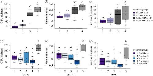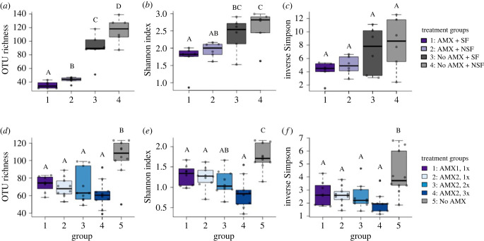 Figure 1. . Microbial richness of groups of Xenopus laevis larvae treated with antimicrobial cocktail or sham control solutions and reared in sterile and non-sterile conditions. (a,d) The number of unique operational taxonomic units (OTUs, a common measure for richness) in tadpoles following five weeks of development in sterile and non-sterile conditions. (b,e) Shannon diversity index values, which measure richness and evenness of OTUs in a community, for groups of X. laevis tadpoles following five weeks of development in sterile and non-sterile conditions. (c,f). Inverse Simpson diversity values, which are an index of dominance of OTUs, for groups of X. laevis tadpoles following five weeks of development in sterile and non-sterile conditions. Box and whisker plots show median values with upper and lower quartiles and maximum and minimum values.