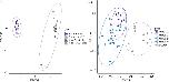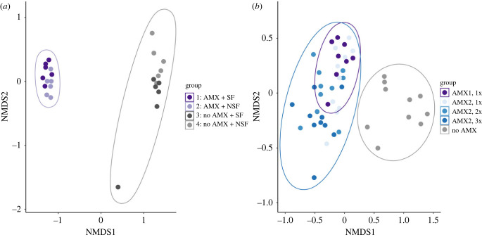 Figure 2. . Non-metric multidimensional scaling (NMDS) ordination of groups of tadpoles treated with antimicrobial cocktail or sham control solutions and reared in sterile and non-sterile conditions. (a) Groups of tadpoles after antimicrobial (AMX; purple points and ellipse) or sham control treatments (no AMX; grey points and ellipse) and reared with sterile food (darker shade of purple and grey points) or non-sterile food (lighter shades of purple and grey points). (b) NMDS ordination of treatment groups of tadpoles after a single treatment of antimicrobial 1 (AMX1; purple points and ellipse) or sham control treatments (no AMX; grey points and ellipse) or antimicrobial 2 (AMX2; blue points and ellipses) that were administered once (light blue points), twice (medium blue points) or three times (dark blue points).