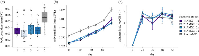 Figure 5. . Body condition after metamorphosis, change in body condition over time in an inoculation experiment, and intensity of infection (pathogen load) after exposure to Batrachochytrium dendrobatidis (Bd). (a) Body condition of frogs taken after rearing in sterile and non-sterile conditions and three weeks after metamorphosis (calculated as mass/snout-to-vent length). (b) Body condition for all groups over time in weeks following Bd exposure (dots indicate mean intensity of infection as determined with quantitative PCR. Error bars indicate standard error of the mean). (c) Intensity of infection (pathogen load) after exposure for all groups throughout the Bd infection. Pathogen load was calculated as log(genomic equivalents (GE) + 1). Error bars indicate standard error of the mean.