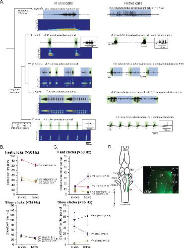 Figure 11. Summary of the two types of vocal central pattern generators with a conserved anatomical organization found in five species of genus Xenopus.Left column: chronogram based on mitochondrial DNA (Modified from Evans et al., 2015) of studied species. Middle column: fictive advertisement calls recorded ex vivo from the isolated brain. The green and blue background of traces indicate fast (>50 Hz) and slow (<35 Hz) clicks, respectively. Right column: schematics showing the types of central pattern generators (CPGs) thought to be contained in the brainstem of each species. A pair of parabrachial (PBN) and nucleus ambiguus (NA) are shown for each species, and the presence of slow CPGs (blue) and fast CPGs (green) are shown in each species, and in two sexes in the case of X. laevis. Dotted slow CPGs in X. amieti and X. cliivi indicate that their presence is yet to be tested in these species. |