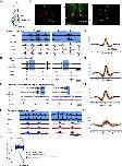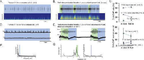 laevis becomes active after testosterone-induced vocal masculinization.(A, B) Amplitude envelope (top) and sound spectrogram (bottom) of a release call (A) and advertisement call (B) recorded in vivo from female X. laevis and testosterone-treated female X. laevis. The blue and green background behind the amplitude envelope indicates slow (<35 Hz) and fast (>50 Hz) clicks, respectively. (C) Click repetition rates and click number per call recorded in vivo and ex vivo from female X. laevis and testosterone-treated female X. laevis. Each triangle with an error bar indicates the mean ± s.e. of click repetition rate (top) and click number per call (bottom). The names of the animal preceded by an asterisk indicate a significant difference between the in vivo and fictive calls. The sample sizes following species name refer to in vivo and fictive data, respectively. (D, E) Fictive release call and advertisement calls recorded from an isolated brain of a female X. laevis and testosterone-treated female X. laevis. Top trace; laryngeal nerve recordings, bottom trace; local field potential (LFP) recordings obtained from the parabrachial nucleus (PBN). The blue and green background behind the amplitude envelope indicates slow (<35 Hz) and fast (>50 Hz) clicks, respectively. The type of stimulus following the species name indicates what was used to elicit the fictive calls shown, and that in parenthesis is another stimulus type that is also effective in eliciting fictive calls. Compare the PBN activity during fast trills to those recorded from the intact female during fictive release calling. (F, G) Mean power spectral density (PSD) of PBN LFP recordings during fictive release calling in female X. laevis (F) and fictive advertisement calling in testosterone-treated female X. laevis (G). Blue and green frames show the mean + std of the CAP rates for fictive release calls, slow trills, and fast trills. |