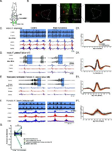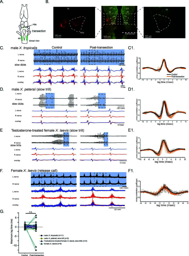 Figure 6. The unilateral transection between the parabrachial nucleus (PBN) and the nucleus ambiguus (NA) did not change the synchrony of the compound action potentials (CAPs) during fictive slow clicks.(A). A cartoon showing the dorsal view of an isolated Xenopus brain, showing the location of the transection that was made between the PBN and NA on the right side with dotted black line. (B). Histological sections of the transected brain. After the electrophysiological experiments, Texas red dextran and fluorescein dextran were deposited into the left and right NA, respectively, to verify that the transection had been completed successfully. The middle panel shows the low-magnification view of the horizontal section of the rostral brainstem showing PBNs on both sides in dotted triangles. Left and right images show magnified view of the PBN with labeled soma and axons on the intact side on the left, and no labeled cells or processes on the transected side on the right. (C - F). Fictive advertisement calls produced by male X. tropicalis (C), male X. petersii(D), testosterone-treated female X. laevis (E), and fictive release calls produced by female X. laevis (F) before (left column) and after (right column) the unilateral transection. Top two traces; left and right laryngeal nerve recordings. The blue background indicates slow CAPs. Areas in dotted rectangles are enlarged in the bottom three traces, the left nerve in blue, the right nerve in red, and both traces are overlayed in the bottom. C1 – F1. Cross-correlation coefficients as a function of the lag between the intact and the transected nerves during fictive advertisement calls produced by male X. tropicalis (C1), slow clicks of advertisement call produced by male X. petersii(D1), testosterone-treated female X. laevis (E1), and fictive release calls produced by female X. laevis (F1). Thick lines indicate the mean of control (black) and post-transection (orange) conditions, and thin lines indicate individual data. Note that the timing of the maximum crosscorrelation coefficient is centered around zero both before and after the unilateral transection. (G). Mean maximum lag time after the transection during fictive slow clicks produced by male X. tropicalis (n=11), male X. petersii (n=3), testosterone-treated female X. laevis (n=2), and female X. laevis (n=9) did not differ significantly from that before the transection. |