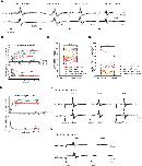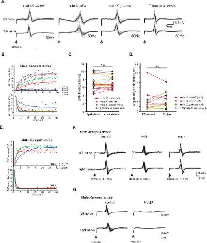 Figure 9. Properties of the synapses between the parabrachial nucleus (PBN) and laryngeal motoneurons in all fast clickers resemble those of male X.laevis.(A). PBN-evoked responses of the left (top panel) and right (bottom panel) laryngeal motor nerves shown as sweeps. Gray traces are raw data, and the thick black lines represent the mean response across 30 stimulus pulses. Arrows indicate the timing of stimulus onset, and the stimulus frequencies are shown below the traces. (B). PBN-evoked CAP amplitude (top graph) and the CAP latency (bottom graph) as a function of stimulus pulse order in response to stimulus trains (10–70 Hz) delivered to a PBN of a male X. amieti brain. Progressive increase in CAP amplitude and attenuation in CAP latency can be successfully fitted with exponential curves, as in male X. laevis. (C). PBN-evoked CAP latency recorded from the ipsilateral and contralateral nerve of all fast clickers. There was no significant difference in the latency between the two nerves. (D). Maximum CAP amplitude evoked in response to the unilateral PBN stimulation and those recorded during fictive advertisement calls. There was no significant difference in the maximum amplitude recorded under these two conditions. (E). Maximum CAP amplitude and the CAP latency as a function of the stimulus pulse number in control, HiDi saline, and washout in a male X. amieti brain. The progressive increase in CAP amplitude and the decrease in CAP latency were observed under all three conditions, indicating that they are monosynaptic. (F). Sweeps of left and right laryngeal nerves in response to the unilateral PBN stimulation in control (left), in the presence of HiDi saline (middle), and after wash. The arrows at the bottom show the timing of stimulus pulse delivery, with the stimulus frequency of 60 Hz in all three conditions. The amplitude used is shown in parenthesis. (G). Sweeps of left and right laryngeal nerves in response to the unilateral PBN stimulation at 60 Hz of male X. amieti in control (left), and in the presence of NBQX (right). The arrows at the bottom show the timing of stimulus pulse delivery. |