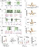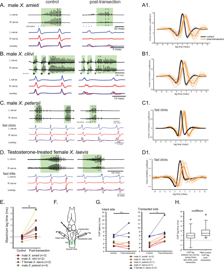 Figure 7. The unilateral transection between the parabrachial nucleus (PBN) and the nucleus ambiguus (NA) resulted in delayed compound action potentials (CAPs) during fictive fast clicks.(A – D), Fictive advertisement calls recorded from male X. amieti (A), male X. cliivi (B), male X. petersii (C), and testosterone-treated female X. laevis (D) before (left) and after (right) the unilateral transection. The top two traces are the laryngeal nerve recordings obtained from the left and right nerves. Green background indicates fictive fast clicks. Areas in dotted rectangles are enlarged in the third, fourth, and fifth traces. In these enlarged traces, the left nerve is shown in blue, the right nerve is shown in red, and both traces are overlayed at the bottom. A1 through D1 shows the cross-correlation coefficients as a function of the lag between the intact and the transected nerves during fictive advertisement calls produced by male X. amieti (A), male X. cliivi (B), fast trills of male X. petersii (C), and testosterone-treated female X. laevis (D) before (black lines) and after (orange lines) the transection. Thick lines indicate the mean and thin lines indicate individual data. (E). Mean maximum lag time for the fast clickers. After the transection, the maximum lag time significantly increased during fast clicks in the fast clickers. (F). A cartoon showing the dorsal view of the brain showing the stimulation of the intact parabrachial nucleus (PBN) before and after the transection was made between the right PBN and the right nucleus ambiguus (NA) while recordings are obtained from both nerves. (G). CAP latency, defined as the time between the stimulus onset and the time of the CAP peak, recorded from the nerve on the intact side and on the transected side before and after the transection. The latency was measured after the 15th stimulus pulse after it reached a plateau (See Figure 8E). The CAP latency on the intact side did not change, but those on the transected side increased significantly after the transection. (H). The box plot showing the increase in the CAP lag after the transection during fictive fast clicks (CAP lag during fictive fast clicks) and the PBN-evoked CAP latency increase after the transection (PBNevoked CAP lag). They did not differ significantly. |