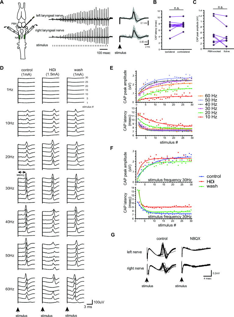 Figure 8. Properties of the synapses between the parabrachial nucleus (PBN) and laryngeal motoneurons in male X. laevis.(A). Left; A cartoon showing the dorsal view of the Xenopus brain showing the location of the stimulation and recordings. PBN; parabrachial nucleus, NA; nucleus ambiguus. Middle; recordings obtained from the left (top panel) and right (bottom panel) laryngeal nerves in response to the stimulus delivered to the right parabrachial nucleus (PBN). Tick marks in the bottom labeled as ‘stimulus’ indicate the timing of the stimulus pulse delivered to the PBN. Right, stimulus-evoked compound action potentials (CAPs) of the left (top panel) and right (bottom panel) laryngeal motor nerves shown as sweeps. Gray traces are raw data, and the thick black lines represent the mean response across 30 stimulus pulses. Arrow indicates the timing of stimulus pulse onset. (B). The latency between the stimulus onset and the time of the compound action potential (CAP) peak recorded from the ipsilateral and contralateral nerves. There is no significant difference in the CAP latency recorded from the two nerves, indicating the presence of bilateral projections from the PBN to the right and left laryngeal motoneurons. (C). The maximum amplitude of the CAPs evoked in response to the unilateral PBN stimulation and those observed during fictive advertisement calling. There was no significant difference in the maximum CAP amplitude recorded under these two conditions. (D). Frequency-dependence of the PBN-evoked CAPs in control (left), high-divalent cation saline (HiDi, middle), and after wash (right). Sweeps of laryngeal nerve response to the 1st, 5th, 10th, 15th, 20th, 25th, and 30th stimulus pulses delivered to the PBN (from bottom to top traces) distributed by 100uV for ease of visualization. Stimulus frequency ranged from 1 to 60 Hz. Note that consistent CAPs, except in response to the first pulse, were elicited when the stimulus frequency is above 10 Hz in control and after wash condition, but in the presence of HiDi saline, some CAPs are skipped. (E). The CAP peak amplitude (top) and the CAP latency (bottom) as a function of the stimulus pulse order when stimulus frequency ranged from 10 to 60 Hz. The progressive potentiation of the CAP amplitude and attenuation of CAP latency in response to each frequency were successfully fitted with exponential curves. (F). The CAP amplitude (top) and the CAP latency (bottom) as a function of stimulus pulse order in the presence and absence of HiDi saline. Stimulus trains at 30 Hz were delivered in control, in HiDi saline, and after wash. Even in HiDi saline, CAPs potentiated in amplitude and decreased in latency as in control and washout conditions, indicating that the synapses are monosynaptic. (G). Sweeps of left and right laryngeal nerve response to the unilateral PBN stimulation in control (left) and in the presence of NBQX (right). |