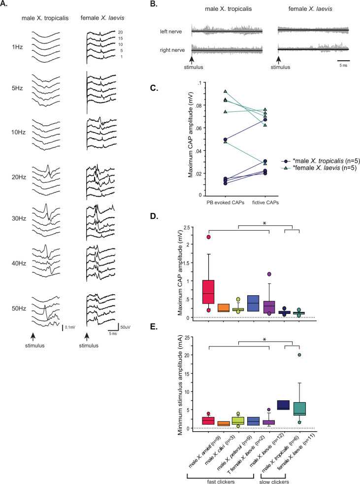 Figure 10. The synapses between the parabrachial nucleus (PBN) and laryngeal motoneurons of slow clickers are weaker and unreliable compared to those of fast clickers.(A). Example of slow clickers that showed compound action potentials in response to the unilateral stimulation of the PBN. Sweeps of laryngeal nerve responses to the 1st, 5th, 10th, 15th, and 20th stimulus pulses delivered to the PBN (from bottom to top traces) distributed by 50uV for ease of visualization. Stimulus frequency ranged from 1 through 50 Hz. (B). Example of slow clickers that showed no compound action potentials in response to the unilateral PBN stimulation. Sweeps of left (top) and right (bottom) laryngeal nerve recordings in response to stimulus pulses. Gray traces are raw data, and the thick black lines are mean responses. (C). Maximum CAP amplitude recorded in response to the unilateral PBN stimulation (PBN-evoked CAPs) and those observed during fictive calling (fictive CAPs) in male X. tropicalis (left), and in female X. laevis. In male X. tropicalis PBN-evoked CAPs were significantly smaller than those recorded during fictive advertisement calls, and in female X. laevis, PBN-evoked CAPs were significantly larger than those recorded during fictive release calls, as indicated by asterisks preceding the species name. (D). Box plot showing the maximum peak amplitude of PBN-evoked CAPs all species and sexes. The maximum peak amplitude of CAPs of the slow clickers was significantly smaller than those recorded from the fast clickers. (E). Minimum stimulus amplitude required to evoke CAPs in response to the unilateral PBN stimulation in all species and sexes. The slow clickers required a significantly higher amplitude of stimulus to evoke CAPs. |
