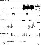 Figure 1—figure supplement 1. Types of stimuli used to elicit fictive advertisement calls.All traces are laryngeal nerve recordings from isolated brain preparations. For all the figures, the upward arrows under the traces indicate the time at which 5HT or 5HT and NMA are applied, and the vertical lines indicate the time at which electrical pulses were delivered to the rostral lateral cerebellum (RLCB, Figure 1D). (A). The application of 5HT and NMA, but not 5HT alone nor electrical stimuli delivered to the RLCB elicit fictive advertisement calls from the brains of X. tropicalis. Top two traces are obtained from the brain of the same individual, and the bottom trace was obtained from another individual. (B). The electrical stimuli delivered to RLCB, but not the application of 5HT elicit fictive advertisement calls from the brains of X. amieti. All the recordings were obtained from the brain of the same individual. (C). Both the application of 5HT and the electrical stimulation delivered to the RLCB elicit fictive advertisement calls from the brains of male X. laevis. Both recordings were obtained from the brain of the same individual. The left-pointing arrow indicates that 5HT was applied to the brain two minutes before the beginning of the trace. |