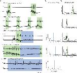 Figure 2. The activity of the parabrachial nucleus during fictive advertisement calls.(A). Local field potential (LFP) recordings obtained from the parabrachial nucleus (PBN) during fictive advertisement calling in male X. amieti (i), male X. cliivi (ii), male X. peterii (iii), male X. laevis (iv), and male X. tropicalis (v). Top traces; laryngeal nerve recording, bottom traces: PBN LFP recordings. The green and blue backgrounds indicate fast (>50 Hz) and slow (<35 Hz) compound action potentials (CAPs), respectively. Vertical lines below the traces labeled with ‘stim’ indicate the timing of electrical pulses delivered to the RLCB (Figure 1D) to elicit fictive advertisement calls in some cases. (B). mean power spectral density (PSD) of PBN LFP recordings during fictive slow clicks seen in A. Blue frames show the mean ± std of the CAP rates for slow clicks. (C). Mean PSD of PBN LFP recordings during fictive fast clicks seen in A. Green frames show the mean ± std of the CAP rates for fast clicks. |