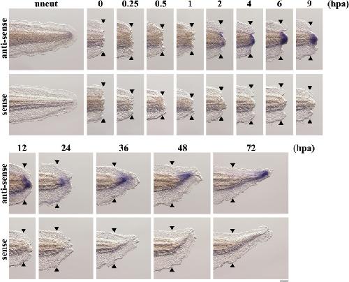Figure 2. Spatiotemporal expression pattern of inhba during Xenopus tail regeneration. Whole-mount in situ hybridization of inhba in uncut tails and in regenerating tails at 0, 0.25, 0.5, 1, 2, 4, 6, 9, 12, 24, 36, 48 and 72 hpa. Negative control using a sense probe shows no signals. Blue/purple signals indicate the expression of inhba. Black arrowheads indicate amputation sites. Scale bar, 200 μm.
